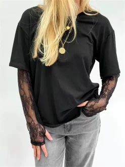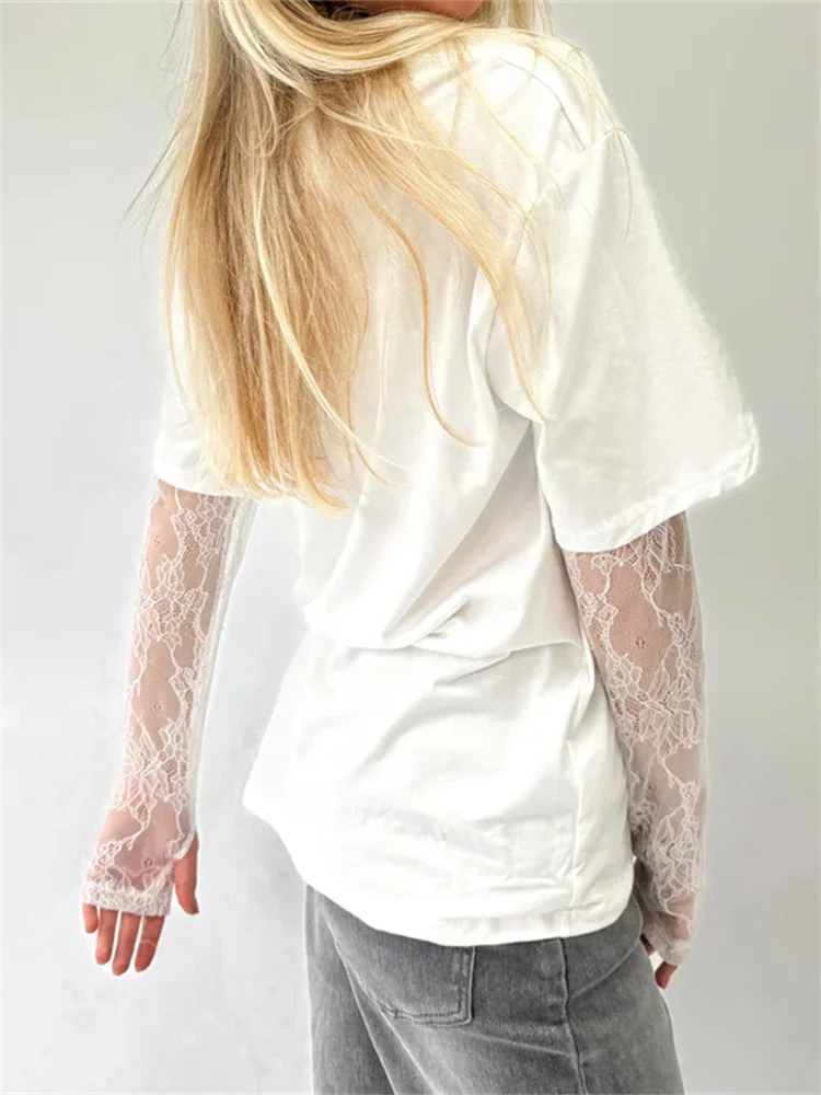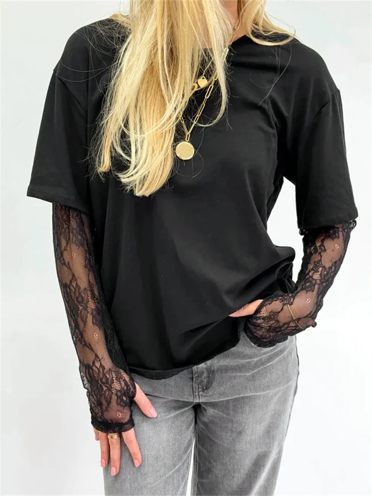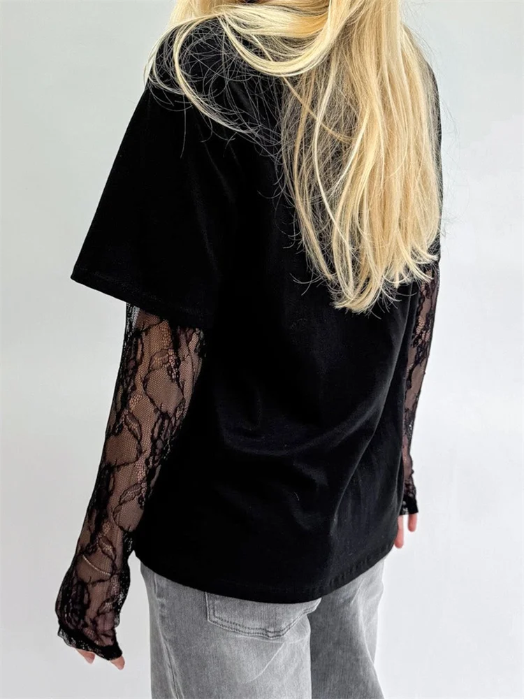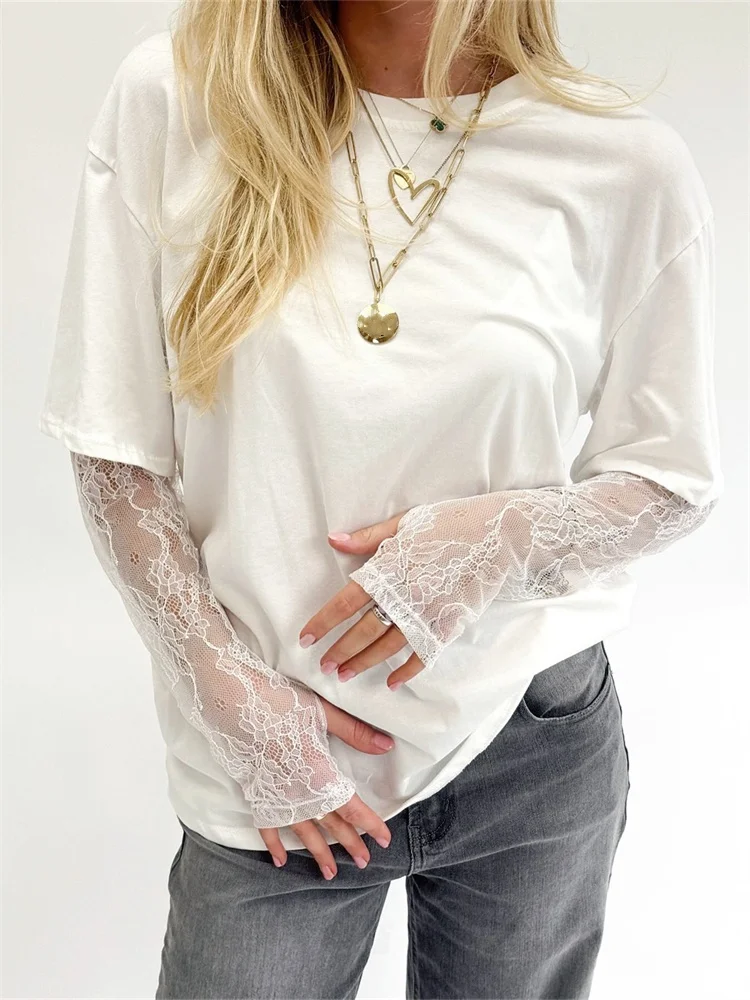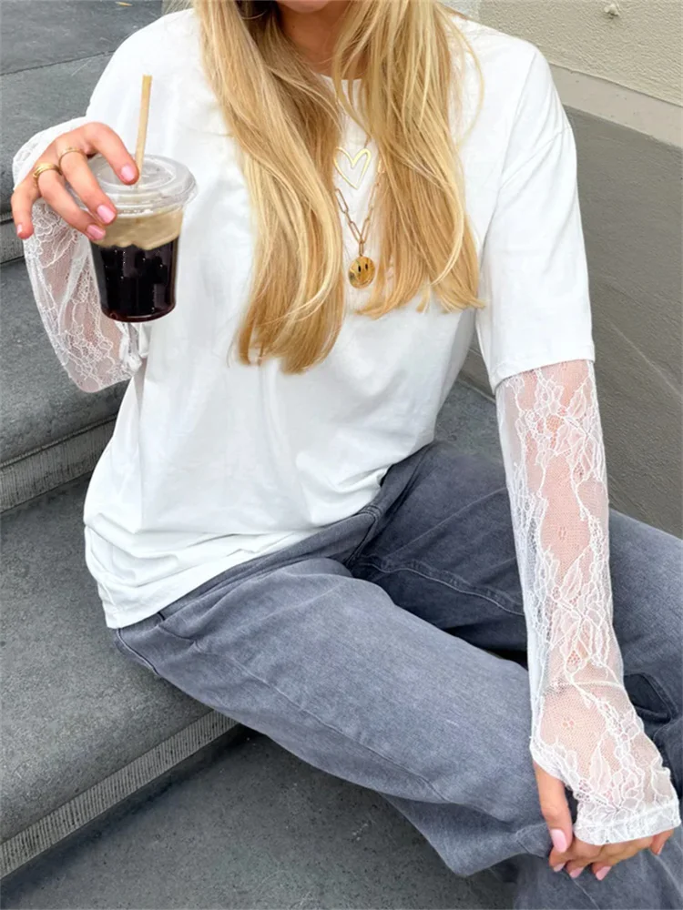 Women Round Neck T-Shirts Lace Long Sleeve Casual Shirts Spring Fall Loose Fit Tops Streetwear
